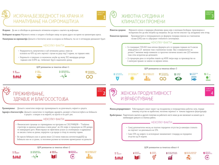 „До шестмесечна возраст, хранење на доенчињата со мајчино млеко и ништо друго, им гарантира извор на храна – уникатно прилагоден на нивните потреби за хранливи материи, а истовремено е безбеден, чист, здрав и достапен, без разлика каде се наоѓаат. Постојат активности што сите може да ги преземеме, им помагаат на жените да дојат онолку долго колку што сакаат. Заштита, промоција и поддршка за доењето, адресирајќи ги нееднаквостите кои стојат на патот на одржливиот развој“, пишува во соопштението.
