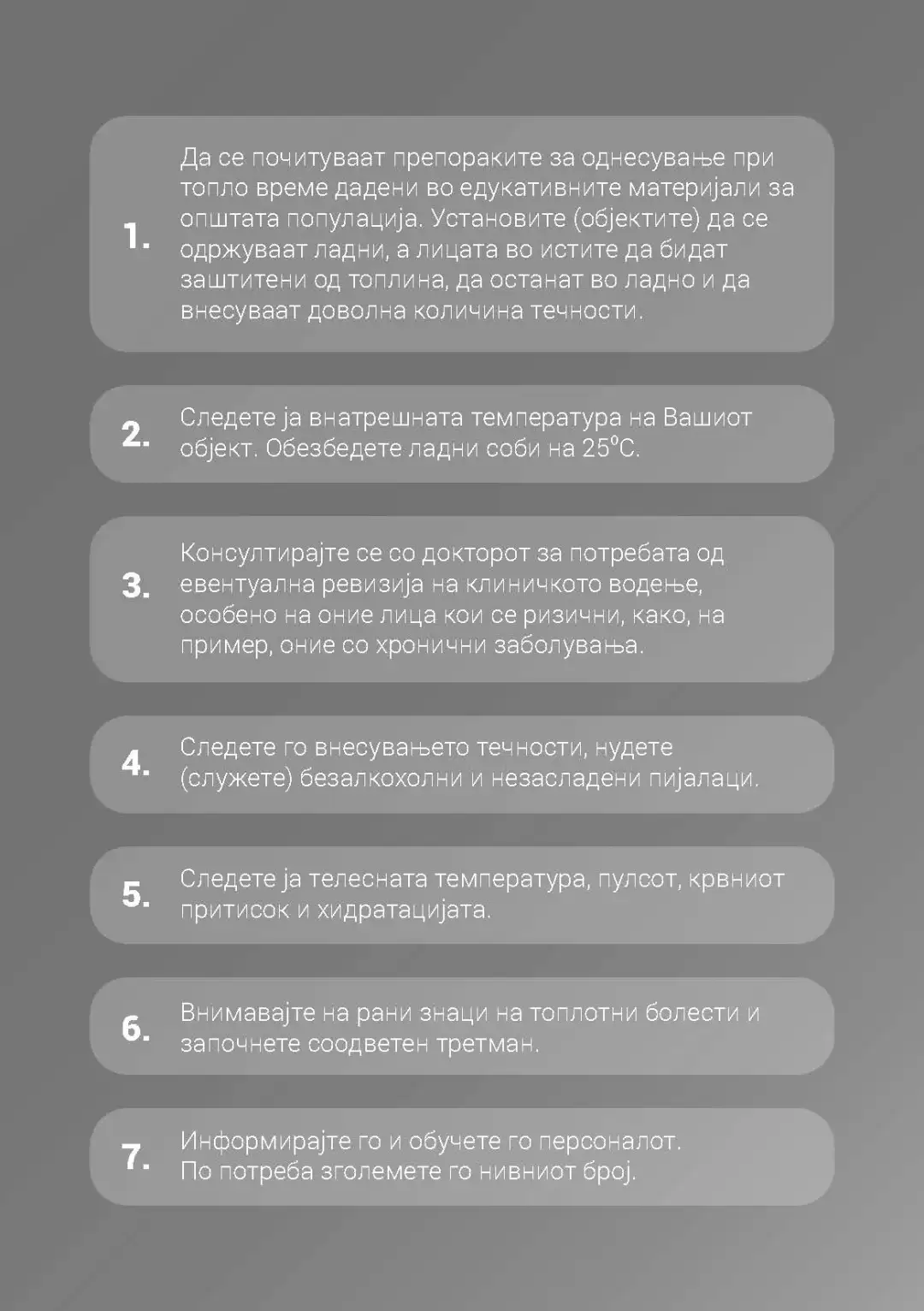 Се апелира повозрасните да избегнуваат изложување на сонце, како и работа на отворено, во периодот од 11 до 17 часот. Да носат лесна, светла и памучна облека, заштитни очила за сонце, капа со висок свод и широк обод и крем со УВ фактор 30+ при изложување на сонце. Да се пие повеќе од вообичаено и да не се чека додека не се почувствува жед за вода. Алкохолните пијалаци да се избегнуваат, како и оние што содржат кофеин, но и екстремно ладните. Доколку лекарот им има поставено некои ограничувања за внес на течности, да се консултираат со него.