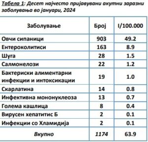 Низ јануари, најчесто регистрирано акутно заразно заболување се овчите сипаници со вкупно 903 пријавени лица. Тие во вкупниот број на заболени во месецот учествуваат со 76,4 отсто, а во групата на десетте најчести заразни заболувања за овој месец учествуваат со 76,9 проценти. На второ место по број на пријавени заболени во месец јануари се ентероколити, со 163 случаи. Во групата на сексуално и крвно преносливи инфекции – без ХИВ/СИДА, се регистрирани четири заболени лица и тоа пријавени се по два случаја на вирусен хепатитис Б и инфекција со хламидија.