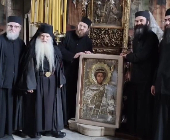 Потсетува дека вчера иконата беше во манастирот Ксенофонт, посветен токму на Светиот Великомаченик, каде иконата и отците биле срдечно и со најголема љубов пречекани од старецот на обителта, архимандритот г. Алексиј, и од неговото монашко братство.