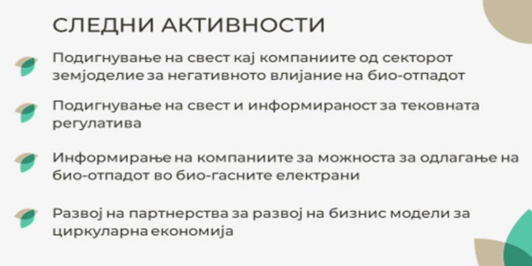 Во изминатиот период беа одржани неколку работни средби со претставници на Министерството за животна средина и просторно планирање, како и на Министерството за земјоделство, шумарство и водостопанство. Законска рамка постои според која оној кој создава отпад има одговорност до крајното решение. Компаниите се должни да го предадат за натамошна обработка или да создадат услови, во рамките на своите капацитети, за обработка и за менаџирање на органскиот отпад, без притоа да креираат штета врз животната средина.