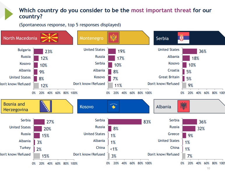 Најголема закана за Македонија е Бугарија, одговориле 23 проценти од македонските граѓани опфатени со анкетата на ИРИ спроведена во февруари и во март годинава со интервјуирање лице в лице на 7.138 возрасни испитаници во шесте земји на Западен Балкан. На второ место е Русија со 12 отсто, на трето Косово со 10 отсто, на четврто Албанија со 9 отсто и на петто САД со 8 отсто.