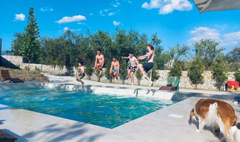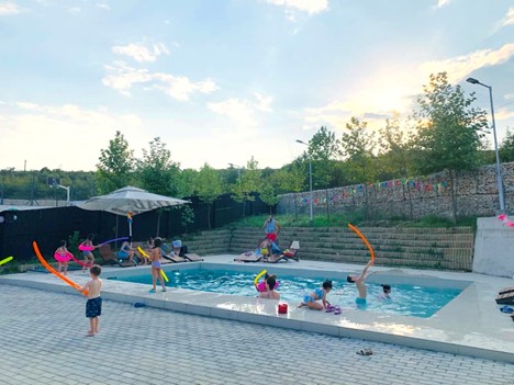 И кога ќе почнат летните горештини, сем што нема да имате специјална потреба од нездрави климатизирани простории или долго возење до некој јавен базен или излетничко место, во склоп на заедничка инфраструктура и на располагање на сите жители на комплексот е сместен и базенот со површина од 10м х 5м, во кој има и дел предвиден за најмалите пливачи. Тука, во непосредна близина до домот неколку месеци ќе бидат вистински рај за вашето слободно време, да впивате сончеви зраци, во мирно опкружување со музика, книга или пијалок во рака и ветре кое ве разладува по големите дрва.