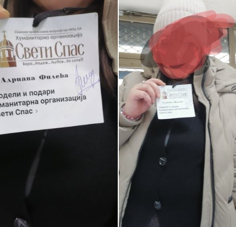 „Вака изгледаат лажните беџови кои што ги користат измамниците (нормално без наш печат), а личноста на сликата е член на организираната група. Наводно личноста којашто е главна на организираната група е извесна Габриела Станојковска и наводно имале канцеларија некаде кај Универзална сала. Благодарност до поддржувачот што ни ги даде овие информации“, објавија од хуманитарната организација „Свети спас“.