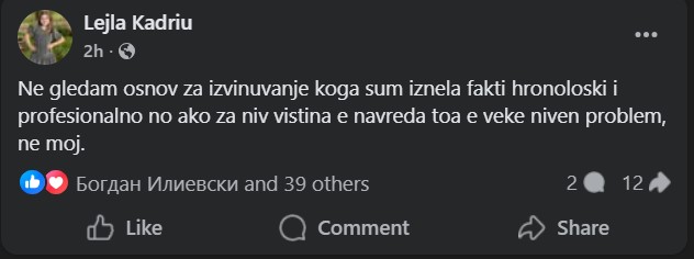 „Не гледам основ за извинување кога сум изнела факти хронолошки и професионално, но ако за нив вистина е навреда, тоа е веќе нивен проблем, не мој“, напиша Кадриу на својот фејсбук профил.