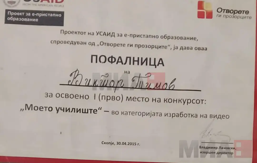 „Тоа е мојот свет. Светот на компјутерите… Имам завршено средно школо за компјутерски техники. Сега одам и во второ специјално школо во Скопје – за графика и дизајн“, вели момчето.