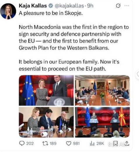 Таа и вчера за заедничката конференција за медиуми со македонскиот премиер Христијан Мицкоски изјави дека Европската Унија останува со Македонија на патот кон целосното интегрирање. „Македонија припаѓа во ЕУ. Вие имате навистина долга историја на усогласувањето со надворешната и безбедносна политика на ЕУ, а тоа нам ни е особено многу важно во овие трубулентни времиња, кога гледаме дека има сериозни геополитички промени во светот“, рече Калас.
