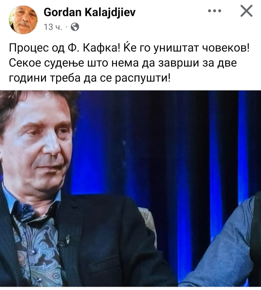 „Процес од Ф.Кафка! Ќе го уништат човеков! Секое судење што нема да заврши за две години треба да се распушти!“, пишува на социјалните мрежи професорот Гордан Калајџиев.