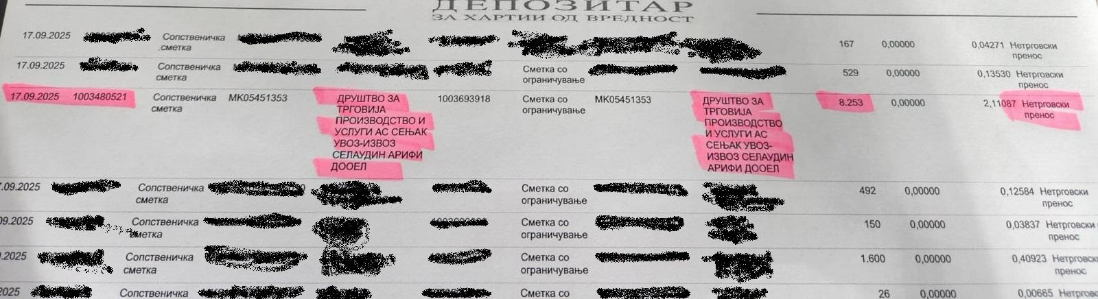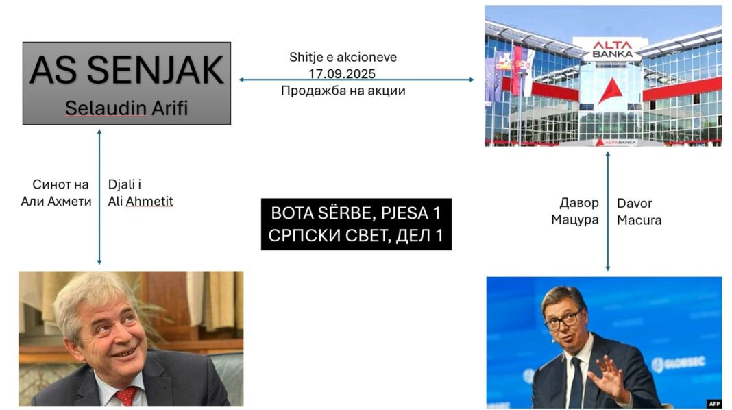 „Фирмата АС Сењак, позната на јавноста по многу други афери, која е во сопственост на сватот на Али Ахмети, односно таткото на сопругата на неговиот син, имала огромен број на акции во Стопанска Банка Битола. Овие акции во сопственост на фамилијата на Али Ахмети се продадени токму на Алта Банка од Белград, чиј сопственик Давор Мацура е директно поврзан со српскиот режим на Александар Вучиќ. Оваа продажба се случила на 17.09.2025. Само пред десет дена. Додека ве лажат за патриотизам, додека ги лажат и нивните коалициони партнери, тие од ДУИ продаваат имот на банката на режимот на Александар Вучиќ. Ова не е случајна бизнис-трансакција. Ова е директна врска на Али Ахмети со Александар Вучиќ. Ова е финансиска врска која го вметнува српскиот режим во банкарски сектор во Македонија. Ова е доказ дека Али Ахмети не е само политички партнер со луѓе од Србија, туку и финансиски дел од мрежата на Вучиќ“, рече Касами.