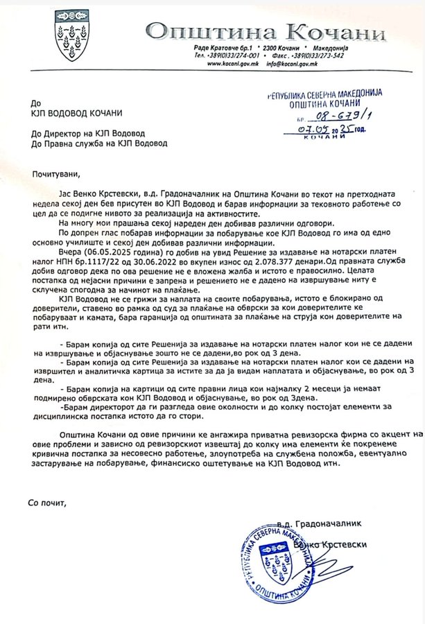 „КЈП Водовод не се грижи за наплата на своите побарувања, истото е блокирано од доверители, ставено во рамка од суд за плаќање на обврски за кои доверителите ќе побаруваат и камата, бара гаранција од Општината за плаќање на струја кон доверителите на рати…“, се наведува во писмото на градоначалникот на Кочани до ЈКП Водовод.