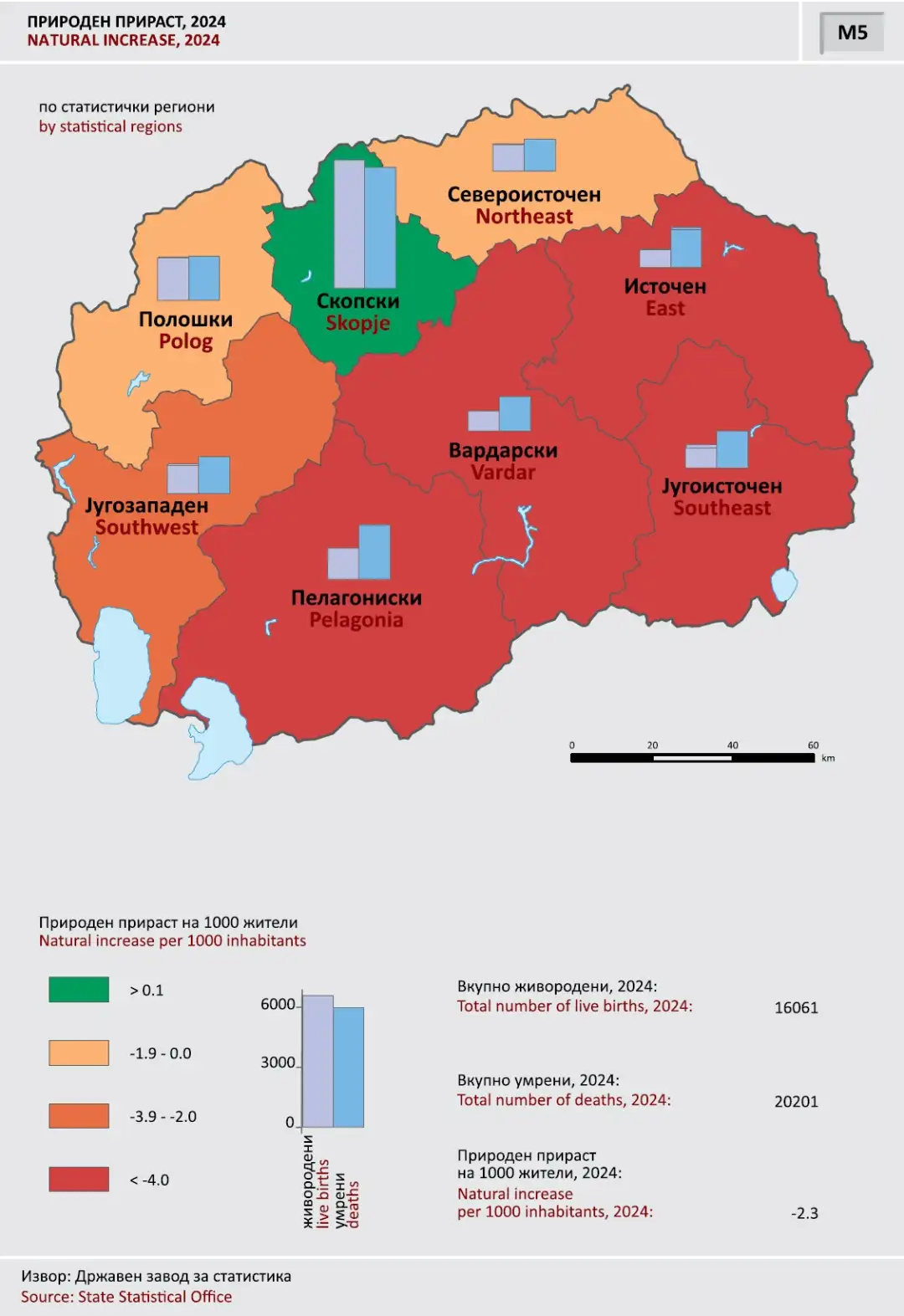 Според последните податоци на Државниот завод за статистика (ДЗС), во последните шест години, од 2019 година Македонија има негативен природен прираст. За една година во земјава се родиле 16.061 дете, а починале 20.201 лице, што е намалување од 4.140 лица. Само за една година бројката на живородените деца е намалена за речиси 700, од 16.737 во 2023, на 16.061 во 2024 година. По региони само во Скопскиот изминатата година имало позитивен природен прираст. Во другите четири региони, Пелагонискиот, Вардарскиот, Источниот и Југоисточниот негативниот прираст на 1.000 жители бил над четири, што е речиси двојно повеќе од просечниот на ниво на држава, кој изнесува 2,3.