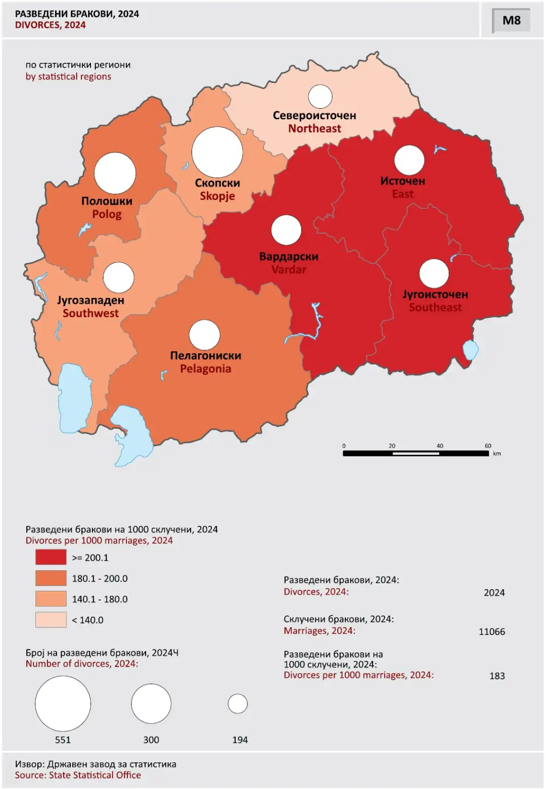 Минатата година во просек на 1.000 склучени бракови имало 183 разведени. Најмногу разведени бракови минатата година на 1.000 склучени имало во Вардарскиот, Источниот и Југоисточниот регион, над 200, а најмалку во Североисточниот регион, помалку од 140.