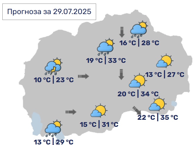 Во Скопје времето ќе биде променливо облачно, во раните утрински и претпладневни часови со повремен пороен дожд и услови за појава на ретки грмежи. Ќе дува слаб до умерен, попладне во делови од котлината повремено засилен северен ветер. Минималната температура ќе се спушти до 19, а максималната ќе достигне до 33 степени.
