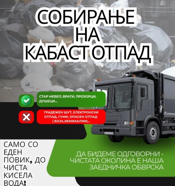 Како кабаст отпад може да се пријави: стар мебел, врати, прозорци, душеци и друг кабаст домашен отпад. Не се прифаќаат градежен шут, електронски отпад, гуми, како и опасен отпад, како бои и хемикалии.