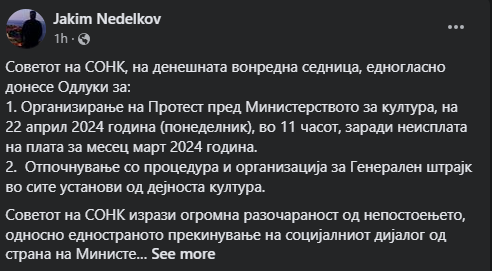 „Советот на СОНК изрази огромна разочараност од непостоењето, односно едностраното прекинување на социјалниот дијалог од страна на Министерството за култура. СОНК постои, силата на СОНК ќе ја почувствувате наскоро“, напиша претседателот на СОНК на фејсбук.