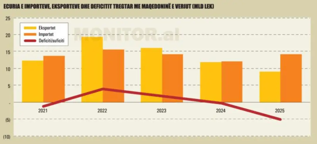 Во 2022 и 2023 година, стои во објавата, Албанија имаше водство во трговијата со Македонија, но ја изгуби оваа предност во следните две години. Трговскиот биланс значително се влоши. Од релативно умерен дефицит од 261 милион леки во 2024 година, Албанија се префрли на длабок дефицит од 5,09 милијарди леки во 2025 година, што претставува влошување од над 4,8 милијарди леки за една година. Овој пресврт го одразува брзиот пад на конкурентноста на албанскиот извоз во соседната земја, додека стоките од Македонија добиваат место на албанскиот пазар.