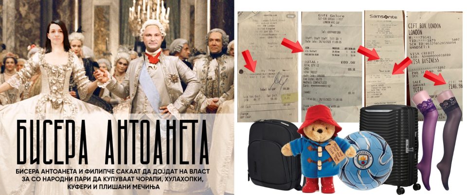 „Има сметка за купен куфер Samsonite Crossover 9.7 од 59 фунти. Таа сметка е доставена лично од Бисера Антоанета до сметководството во Министерството за култура, а ова е нејзиниот потпис на истата. Бисера Антоанета куферите ги купила на 26 октомври 2023, и тоа се гледа од оваа сметка каде како купувач е запишана таа, и на која истата се потпишала кога ја однела во Министерството за култура за да ги правда потрошените пари. Одиме со следна сметка, од 219 фунти и поголемиот куфер Samsonite Upscape spiner, и на оваа сметка се гледа дека Бисера Антоанета е купувачот и на оваа сметка се гледа дека шопингот го правела на 26 октомври 2023 година“, рече Лефков.