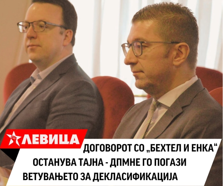 „Министерот за транспорт Александар Николоски на 26 јуни 2024 упати ветување до јавноста дека ќе го декласифицира договорот со Бехтел и Енка. По само две недели изјави дека тоа нема да се случи. Како политичка партија која се залага за транспарентност и одговорно управување со државните ресурси, Левица изразува длабока загриженост поради договорот кој е финансиран со пари на граѓаните, а останува класифициран како државна тајна. Оваа влада, со своето прикривање на клучни информации од јавноста, покажува дека се обидува да спроведе проект кој потенцијално може да има огромни негативни последици по државниот буџет и економската стабилност на Република Македонија“, соопштија денеска од Левица.