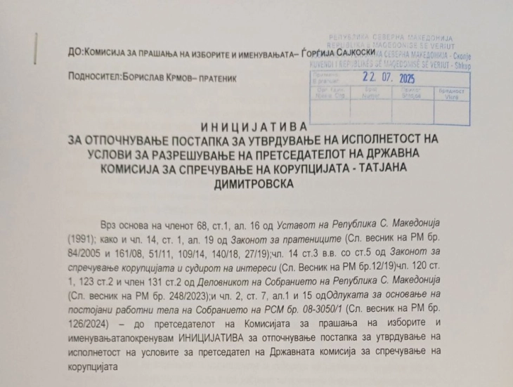 „Во член 11 се условите кои треба да ги исполнува председателката на антикорупциска комисија за да стане председател на ДКСК. Меѓу едни од условите во член 11 е тоа дека не смее да ѝ биде изречена мерка за забрана за вршење на професија. Во овој момент на претседателката на комисијата, Татјана Димитровска ѝ се изречени мерки за забрана за вршење на професија. Нели таа повеќе од два месеца не оди на работа и токму тука ја наоѓаме законската основа во овој случај, да ја поднесеме нашата иницијатива до Комисијата за прашања на изборите и именувањата“, рече Мојсовска.