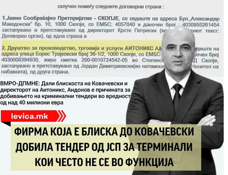 „Токму ДПМНЕ во опозиција тврдеше дека познанството на Ковачевски со сопственикот на Аитоникс е пресудно за добивање на тендерите и најавуваа дека ќе има одговорност за криминалот со софтверски лиценци. Актуелниот директор на ЈСП, Драги Кушовски потребно е веднаш да изврши проверка на квалитетот и сообразност на тековно испорачаните услуги и изведбата во однос на техничката спецификација.Со оглед на тоа што се работи за милионски договор од претпријатие кое е заглавено во долгови, потребно е раководството итно да испита дали се применуваат прописите, стандардите и техничките нормативи согласно одредбите на договорот? Ја потсетуваме и актуелната влада предводена од Мицкоски дека ветуваше одговорност за криминално склучените тендери на СДС токму со оваа компанија – па оттаму, ги повикуваме да иницираат истражни постапки и за договорот вреден 2 милиони евра, склучен со јавното претпријатие за превоз“, велат од Левица.