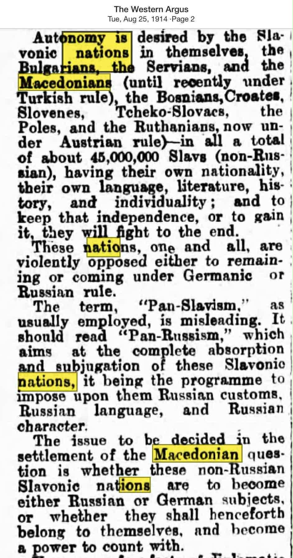 Дилемата што треба да се реши при решавањето на македонското прашање е дали овие неруски словенски нации ќе станат руски или германски поданици, или отсега ќе си припаѓаат себеси и ќе станат сила со која може да се смета“, се вели во извештајот на австралискиот весник за позициите во Европа, на почетокот на Првата светска војна.