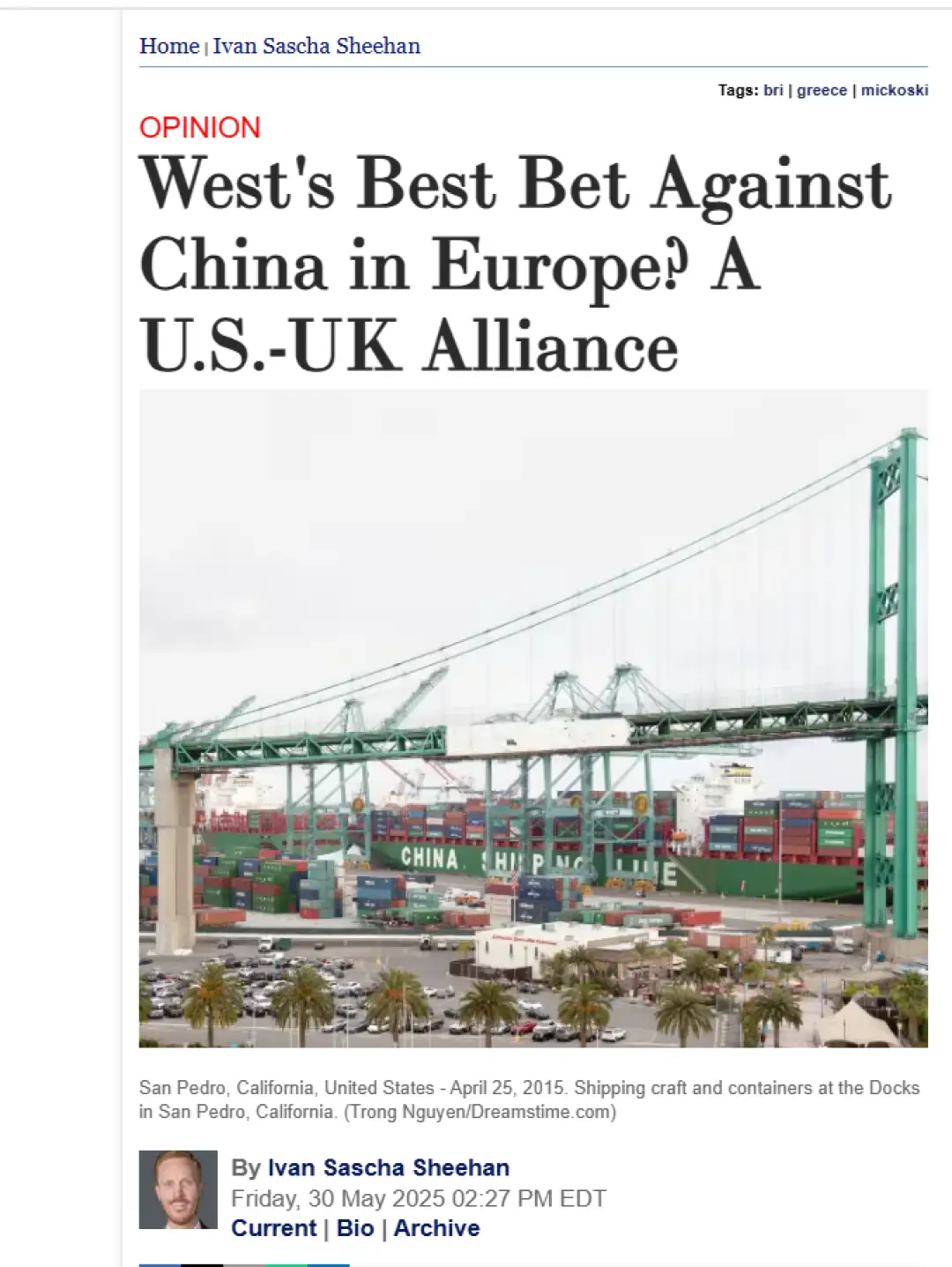 Во статијата „Најдобриот залог на Западот против Кина во Европа? Алијанса САД-Велика Британија“ Иван Саша Шихан додава:
