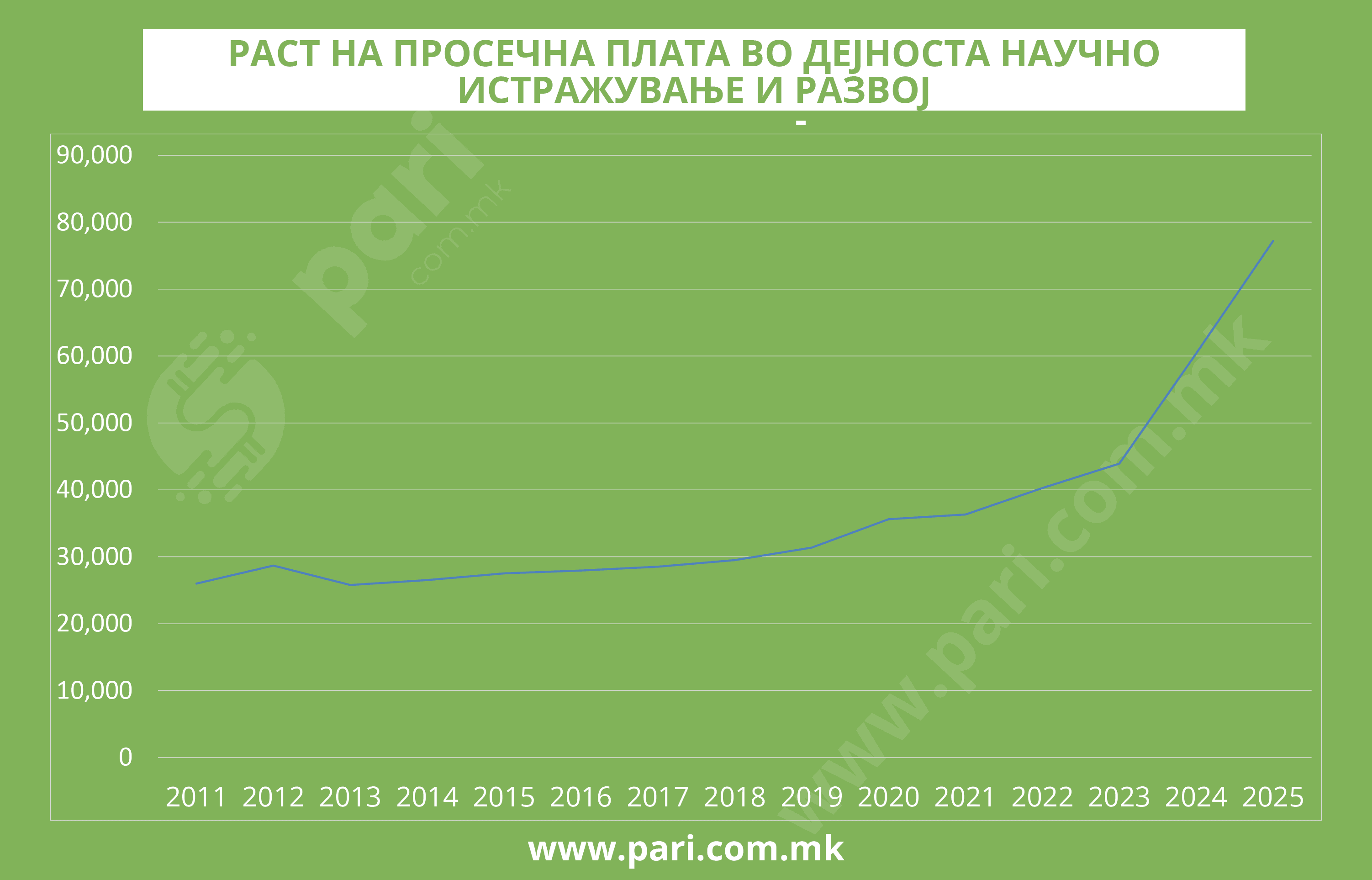 Значително е зголемена просечната плата во компаниите и институциите за научно истражување и развој, од 25.995 денари во 2011 година на 77.200 денари во 2025 година.