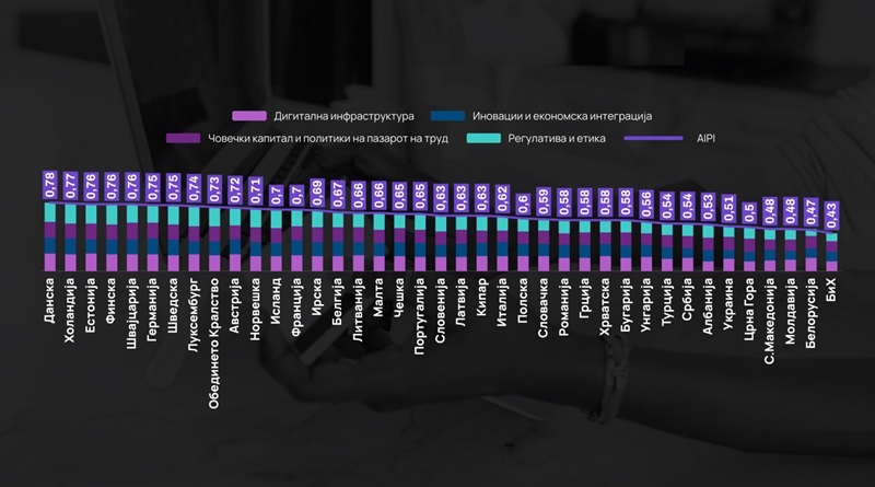 Анализиран е и AI Preparedness Index (AIPI), индекс на Меѓународниот монетарен фонд кој ја мери подготвеноста на земјите за одржлива и инклузивна примена на вештачката интелигенција. Со резултат од 0,48, Македонија заостанува зад просекот на ЕУ и зад поголем дел од балканските пазари, при што полош резултат има само Босна и Херцеговина. За споредба, европските лидери како Данска, Холандија и Естонија имаат индекс над 0,76.