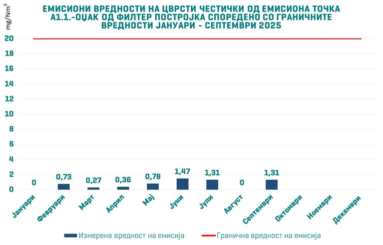 На емисионата точка Оџак од филтер постројка највисоката измерена вредност во третиот квартал од 2025 година изнесува 1,31 милиграми на метар кубен, што е околу