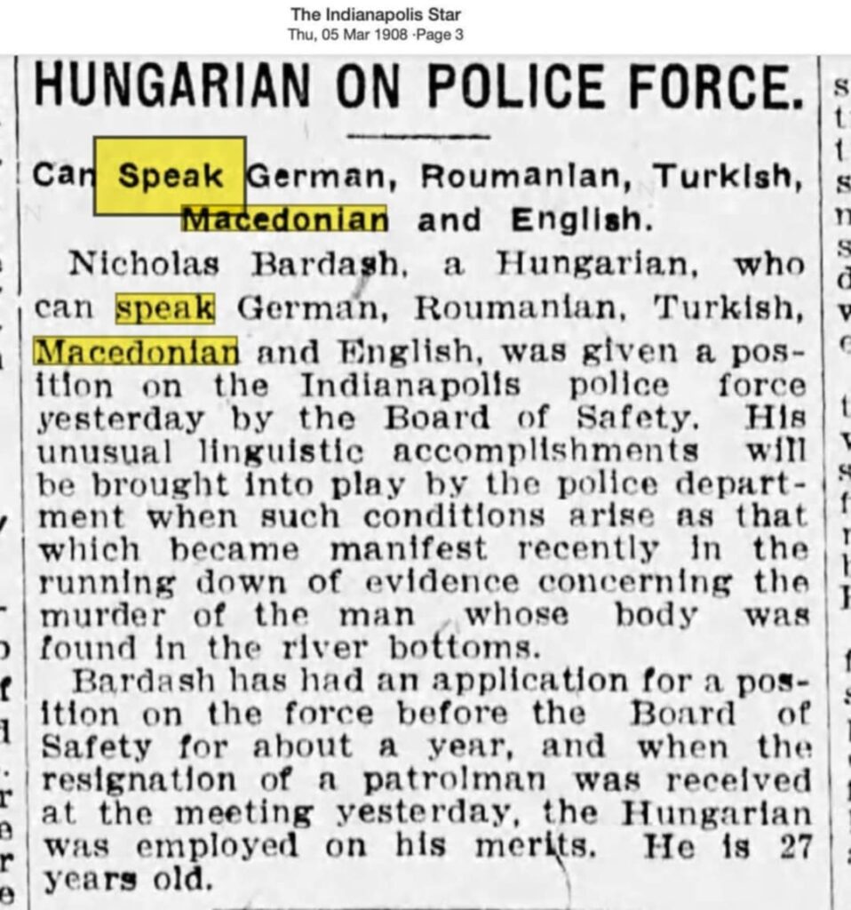 Осум години пред тоа, на 5 мај 1908 година Индијанаполис стар (Indianapolis Star) пишува за унапредувањето на Унгарецот Николас Бардаш во полицијата на Индианаполис, со истакнување на неговото познавање на германскиот, романскиот, турскиот, македонскиот и англискиот јазик.