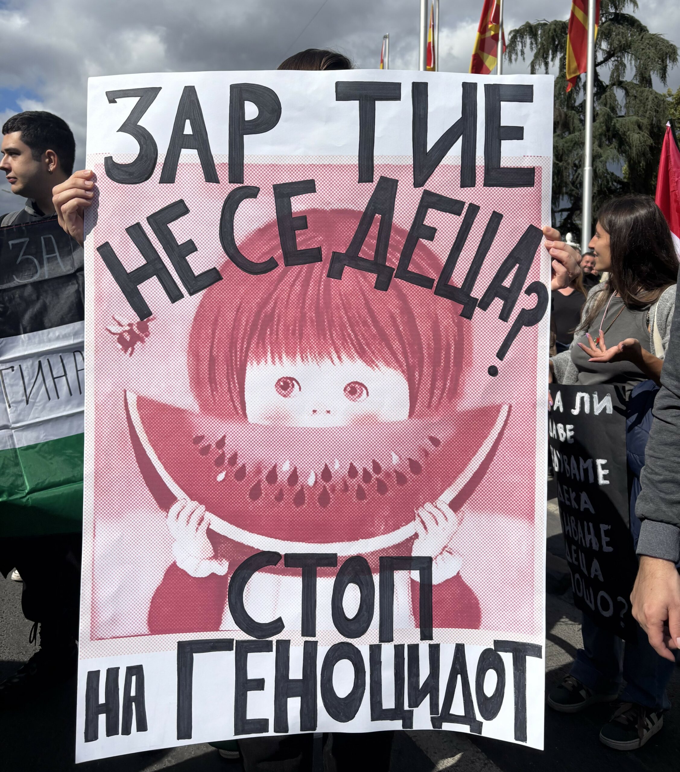 „Веќе две години нашите влади го срамат угледот на Македонија на меѓународно ниво. Наместо независна и принципиелна политика, гледаме пасивност и усогласување со туѓи интереси. Македонија денес избира да го сврти погледот од геноцидот, и тоа е политичка одлука, не неутралност“, рече еден од претставниците на иницијативата „Сите за Палестина“.