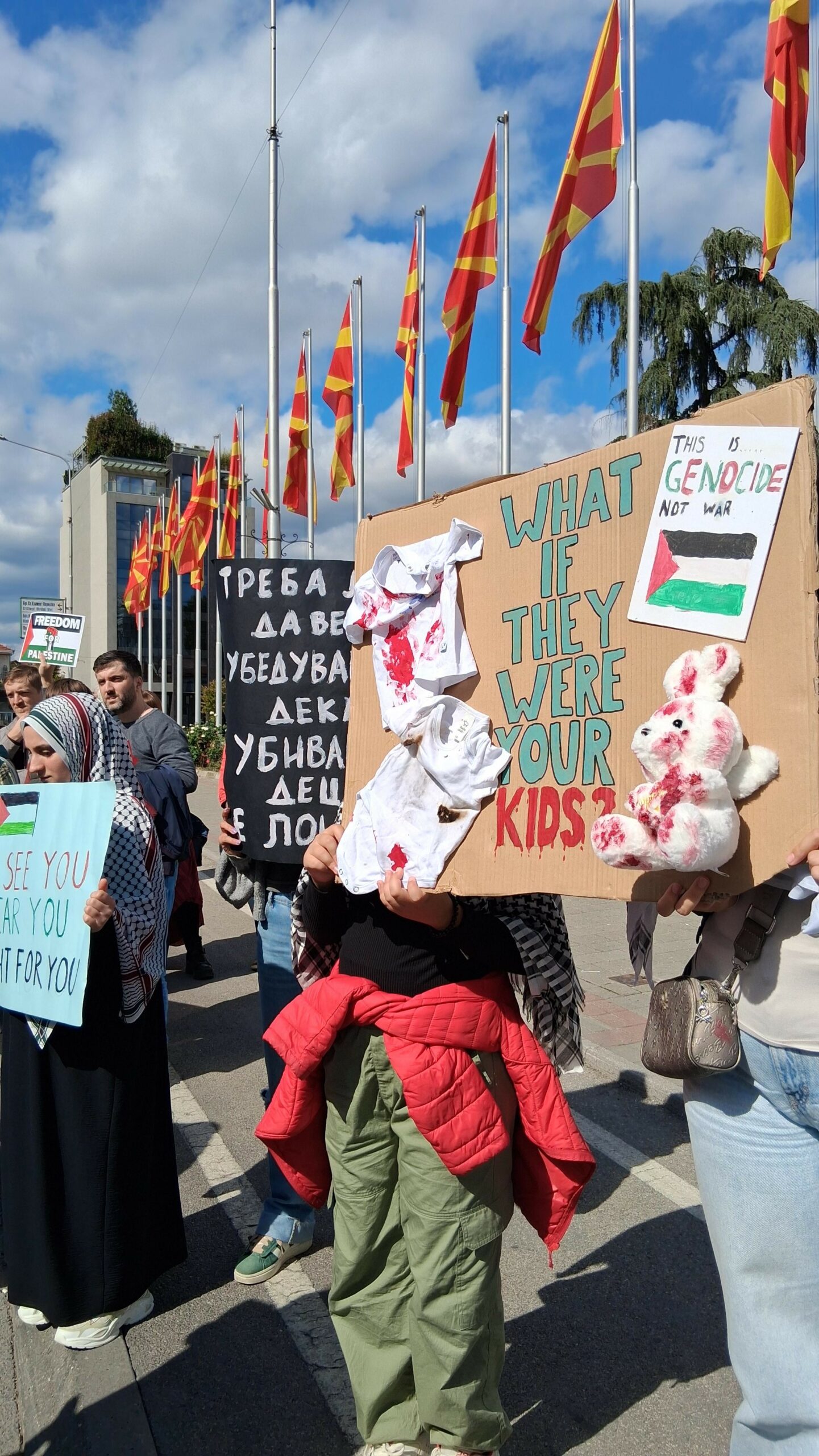 „Нивната мака е огледало на нашата македонска мака. Нивната борба за парче сопствена земја е истата борба што нашите дедовци ја воделе, а ние и денес ја продолжуваме“, порача еден од говорниците на протестот. „Како што Македонија беше распарчена по војните, така и Палестина денес е окупирана и поделена. Болката на палестинската мајка е иста со болката на нашите баби прогонети од Егеј.“