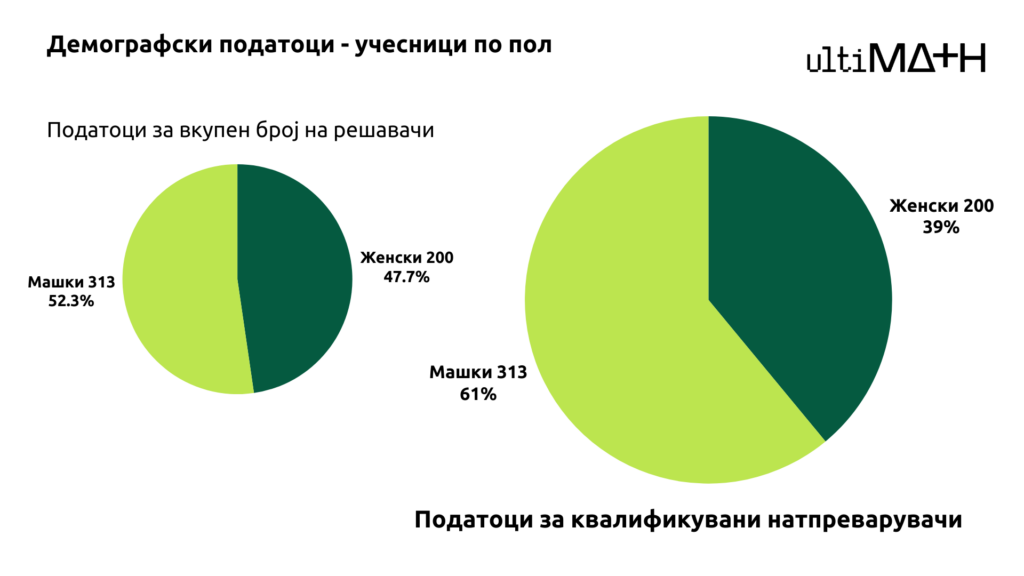 Најмногу математичари има во Скопје, и според учество и според квалификувани кандидати, по што следат Битола и Охрид. Во квалификациската фаза учеството на жени и на мажи е речиси изедначено со 47,7% кандидатки наспроти 52,3% кандидати, но во квалификуваните за финалето на UltiMATH доминираат мажите со 61% наспроти жените со 39%.