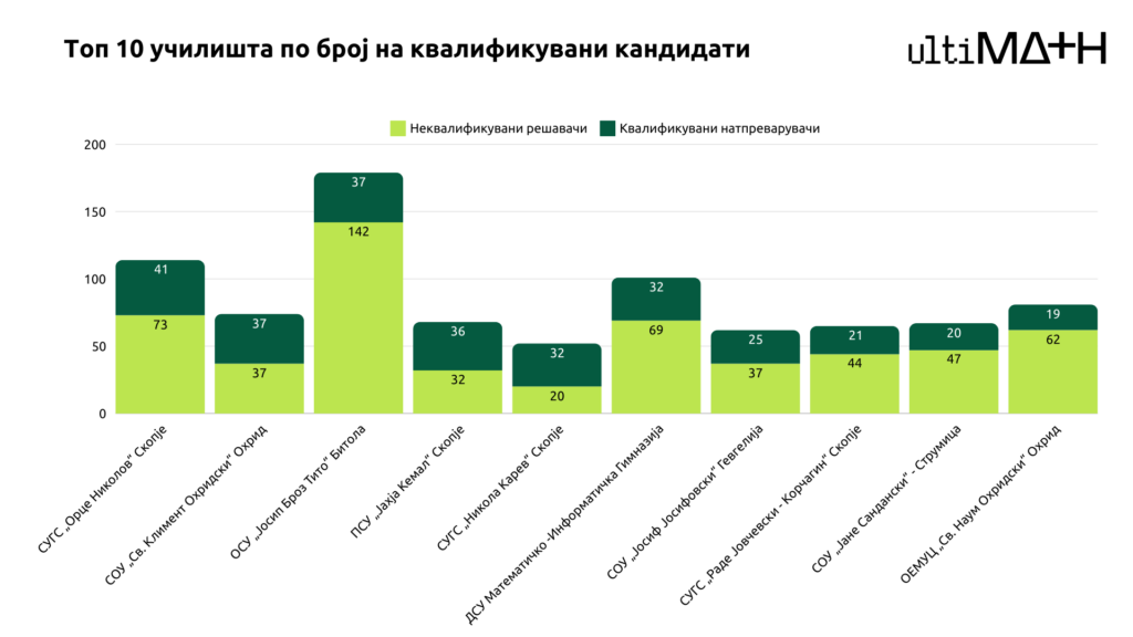 Најмногу квалификувани учесници има од гимназиите „Орце Николов“ – Скопје 41 и „Јосип Броз Тито – Битола“ 37, по што следува охридската „Св. Климент Охридски“ исто со 37 учесници, „Јахја Кемал“ со 36 и со по 32 учесници гимназијата од Скопје „Никола Карев“ и ДСУ Математичко-информатичка гимназија.
