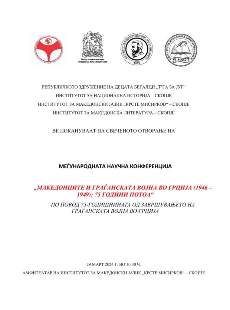 Научната конференција е во организација на Републичкото здружение на децата бегалци „Т’га за југ“, заедно со три научни институти при Универзитетот „Св. Кирил и Методиј“ – Институтот за национална историја, Институтот за македонска литература и Институтот за македонски јазик „Крсте Мисирков“.