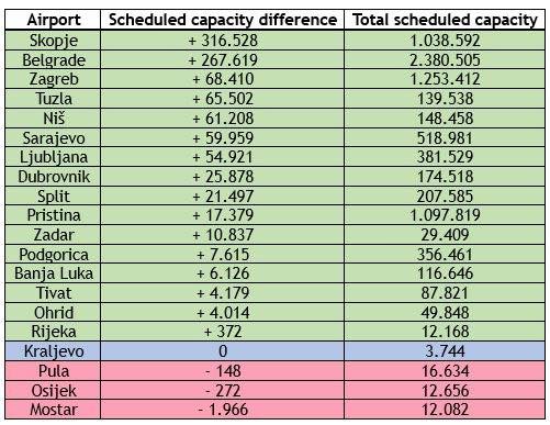 За првиот квартал од 2026 година скопскиот аеродром нуди 316.528 повеќе седишта споредено со истиот квартал од 2025 година, што го прави апсолутен лидер во регионот. Зад Меѓународниот аеродром Скопје е аеродромот со Белград со 267.000 повеќе седишта или 100.000 помалку од Скопје, а далеку зад скопскиот аеродром е аеродромот во Загреб со само 68.000 повеќе понудени седишта во првиот квартал во 2026 година.
