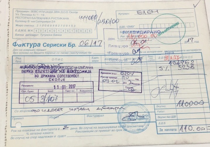 „Што се јадело и пиело на сметка на народот, виски Џони вокер – блек, ракија Дуњовача, поховани јагнешки шницли, купус салата, ќебапи, крвав бифтек, чоколадно суфле, крем пита ‘И као да си Анџео’“. Ова е фактура за кетеринг услуги, 110 илјади денари во еден ресторан во Скопје. Исто така потпишано од Кочоска и Мицкоски. Еве уште една фактура, 38.000 денари, од еден ресторан во Брвеница. Потпис, Кочоска и Мицкоски. Една минимална плата, едно седнување, 21.270 денари во истиот ресотран. Истата Кочоска која заедно со Мицкоски не даваат да се покачи минималната плата, им кажуваат на граѓаните и работниците каков грашок да јадат, дали треба цреши и грозје да си купат. Гозби, ручеци, кетернзи. Како да не знаеле да сопрат од кафани и ресторани. Нова фактура, 10.500 денари на ЕЛЕМ, сектор финансии, од познат ресторан во Скопје. Уште една, 8.500 денари, ресторан во Брвеница. Па уште една, 9.200 денари. Сите, во време кога со ЕЛЕМ управува Мицкоски а Кочоска е директор за финансии“, обвини Костовски.