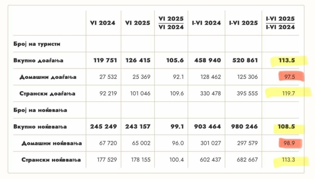 Tој пишува дека во истиот период од 2025 година има за 8,5 отсто повеќе реализирани ноќевања споредено со првата половина од 2024 година.