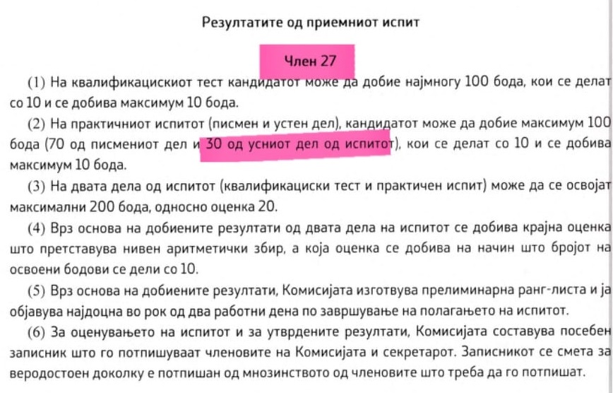 Имено, во Академијата тие што сакаат да се вработат како слушатели за идни судии и обвинители, треба да полагаат и практичен испит за кој пред законските измени беа предвидени вкупно 100 бодови (70 бода од писмениот дел и 30 бода од усмениот дел). Со законските измени (Сл.весник бр.53/2024), за да се зголеми уделот на субјективниот фактор во бодувањето, неспособните министерот Кренар и заменичката Мадиќ, предложија, а пратениците од СДСМ и ДУИ изгласаа, да се добиваат 35 бода од усмениот дел на испитот. И сега Законот за Академија за судии има контрадикторен чл.45 кој во ставовите 9 и 13 пропишува 105 бодови од полагањето на практичниот испит, а во ставот 14 на истиот член е императивно наведува дека ‘на практичниот испит можат да се освојат најмногу 100 бода’. Конфузијата е толку голема што во еден ист член 45, а во различни ставови и тоа: (9), (13) и (14) од Законот за АСЈО, се пропишува дека збирот од практичниот испит предвиден во ставовите (9) и (13) изнесува вкупно 105 бода, што е во спротивност со вкупниот број на бодови кој е пропишан за практичниот дел од приемниот испит во ставот (14), а кој пак изнесува вкупно 100 бода.