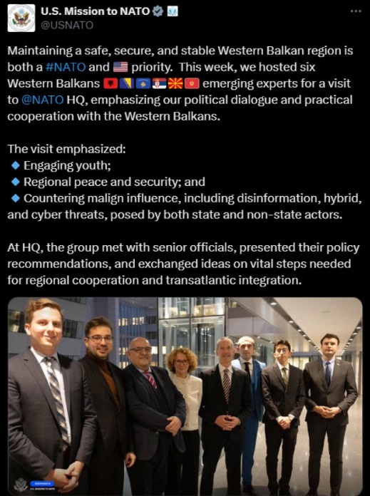„Оваа недела, бевме домаќини на шест експерти од Западен Балкан – од Албанија, Босна и Херцеговина, Србија, Северна Македонија и Црна Гора – во седиштето на НАТО, истакнувајќи го нашиот политички дијалог и практична соработка со Западен Балкан“, се нагласува во објава на Мисијата на САД во НАТО на платформата X.