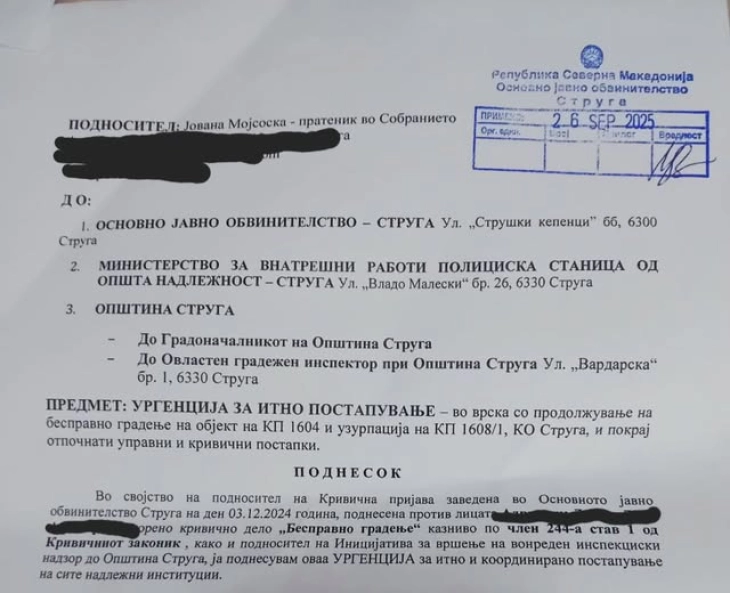 Во ургенцијата Мојсоска бара продолжување на постапката за бесправно градење на објект и узурпација на државно земјиште, нагласувајќи дека и покрај започнатите управни и кривични постапки, изградбата продолжува.