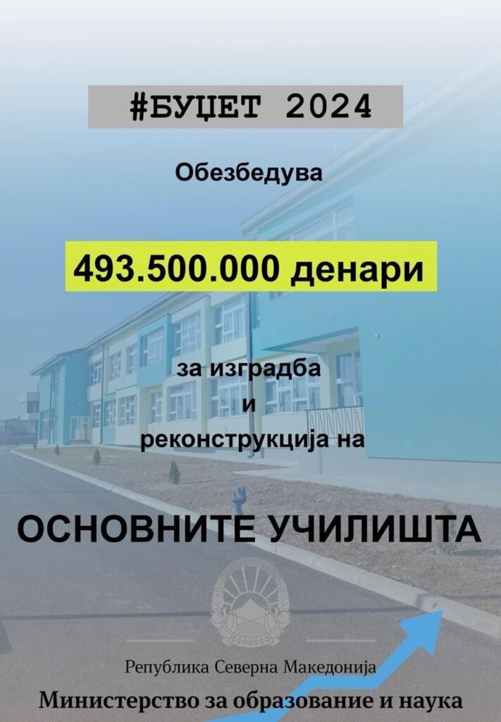 Лани реконструиравме 80-тина училишни објекти, а изградивме и 4 нови. Годинава со реконструктивни активности ќе опфатиме 90-ина училишни објекти, ќе почне изградбата на пет нови, ќе се прошират просторните капацитети во постоечки 15, а почнува и етапната реконструкција на девет државни студентски домови.