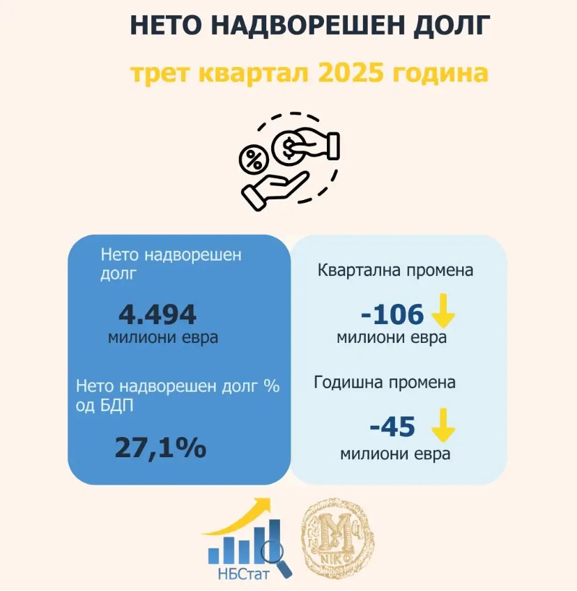 „На 30 септември 2025 година, нето надворешниот долг изнесува 4,494 милиони евра (или 27,1 отсто од проектираниот БДП). Нето надворешниот долг на земјата, во третиот квартал од 2025 година, е намален за 106 милиони евра, или за 2,3 отсто. Од аспект на структурата, приватниот нето-долг и натаму има поголемо учество во вкупниот нето-долг со 67 отсто“, се наведува во соопштението од Народната банка.