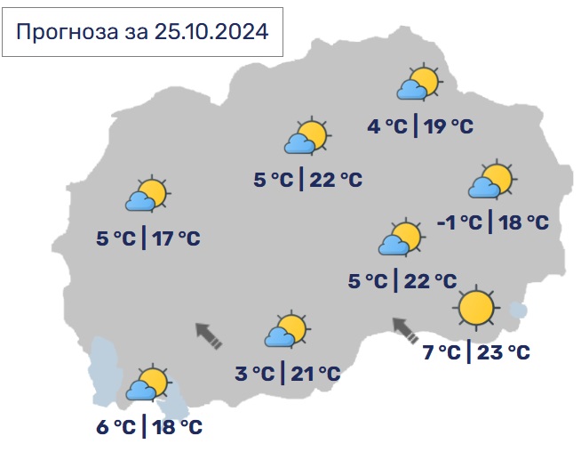 Утре наутро ќе биде студено, по одделни котлини и речни долини со услови за појава на магла. Преку денот сончево со мала локална облачност. Ќе дува слаб до умерен ветер од југоисточен правец. Дневните температури ќе се движат од 18 до 24 Целзиусови степени.