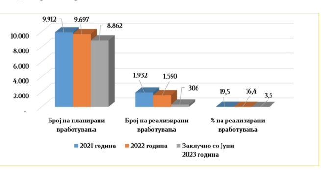 Во однос на плановите за вработување со кои институциите ги планираат потребните годишни вработувања констатирано е дека не се донесени во законски утврдените рокови, што влијае на степенот на реализација на вработувањата. Во 2021 година реализирани се само 19,5 проценти од вкупно планираните вработувања, додека во 2022 година реализирани се само 16 проценти.