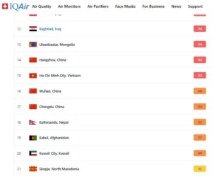 На интернет страницата Ервижуал, која го следи квалитетот на воздухот во големите и главни градови во светот, Скопје малку по 10 часот се наоѓа на 21-то место. Пред Скопје нема ниту еден град од Европа, барем не на оваа листа што ја составува од час во час Ервижуал.