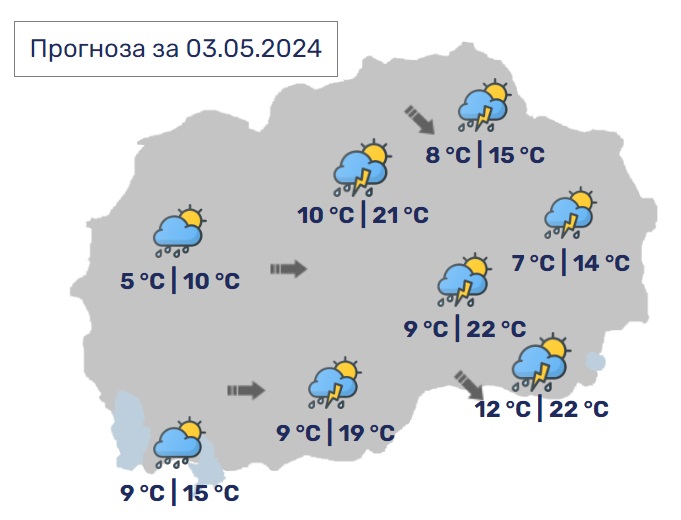 Во Скопје променливо облачно и нестабилно со пороен дожд и грмежи. Во делови од котлината ќе има услови за краткотрајно невреме со засилен ветер и изолирана појава на град. Минималната температура ќе се спушти до 10, а максималната ќе достигне до 21 степен.