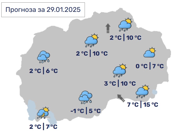 Во Скопје, променливо облачно, наутро магливо и претежно тивко. Од крајот на денот и преку ноќта ќе има повремен дожд.
