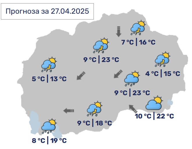 Во Скопје, променливо облачно, попладне во делови од котлината ќе биде нестабилно со пороен дожд, грмежи, засилен ветер и услови за изолирана појава на град.