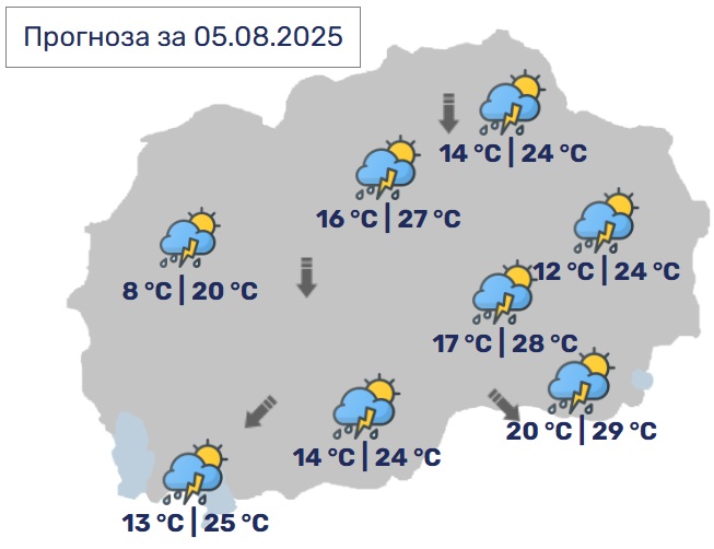 И во Скопје ќе биде променливо облачно, во делови од котлината ќе биде нестабилно со пороен дожд, грмежи, засилен ветер и услови за изолирана појава на град. Минималната температура ќе се спушти до 16, а максималната ќе достигне до 27 степени Целзиусови.